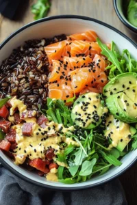 Frische Poké Bowl mit Wildreis und Lachs