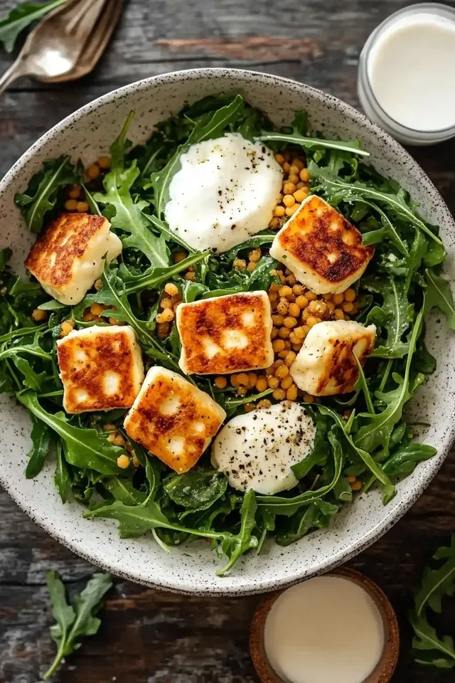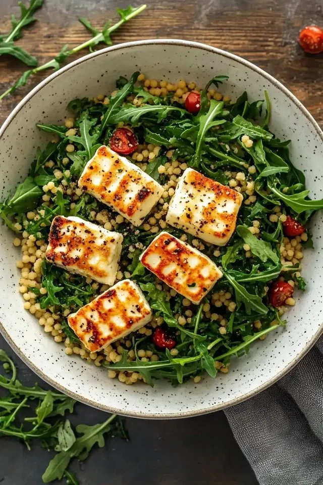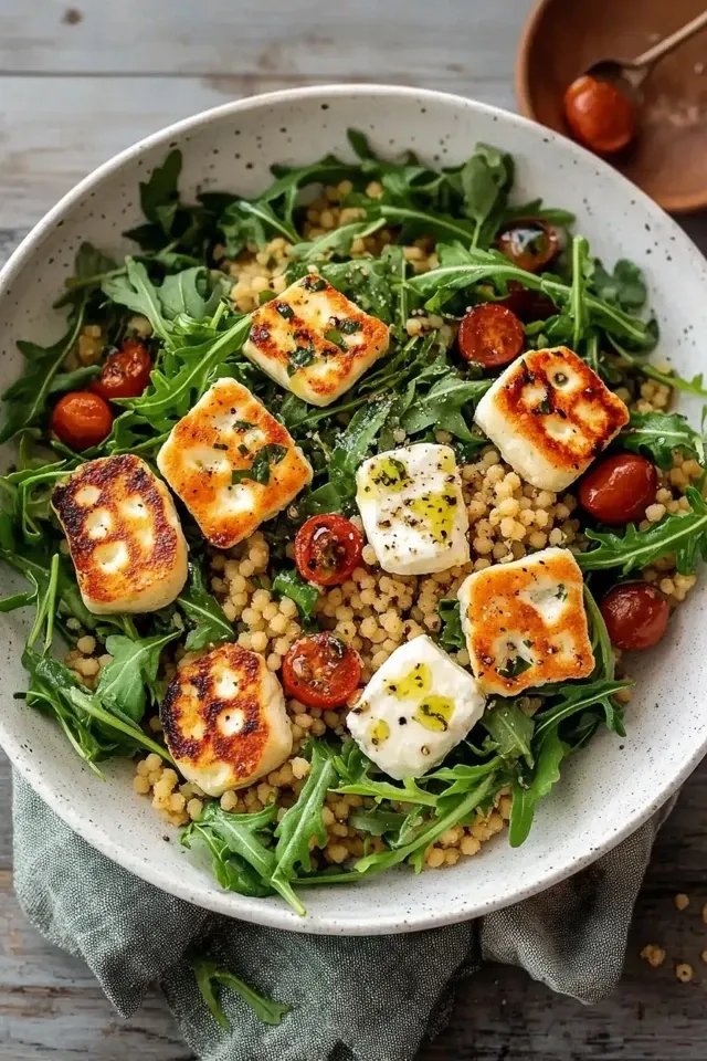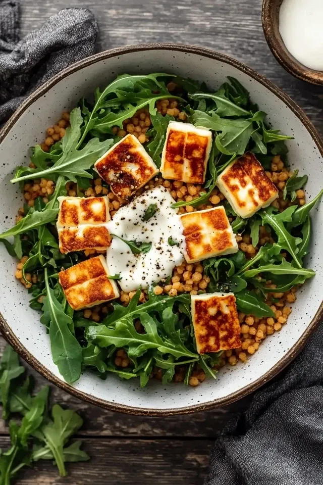 Dieser frische und leichte Couscous-Rucola-Salat mit gegrilltem Halloumi und einem cremigen Joghurt-Dressing ist eine perfekte Mahlzeit für warme Tage oder als schnelle Option für Mittag- und Abendessen.
