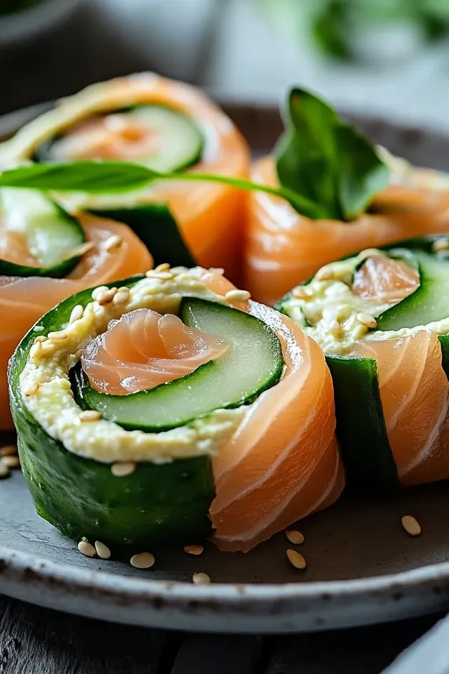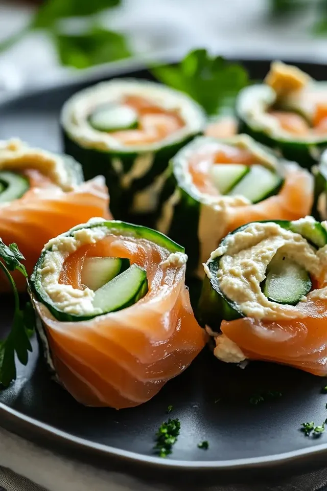 Diese einfachen, aber eleganten Röllchen vereinen zarten geräucherten Lachs, knackige Gurkenstreifen und cremigen Hummus zu einer unwiderstehlichen Vorspeise oder einem gesunden Snack. Schnell zubereitet und voller Geschmack.