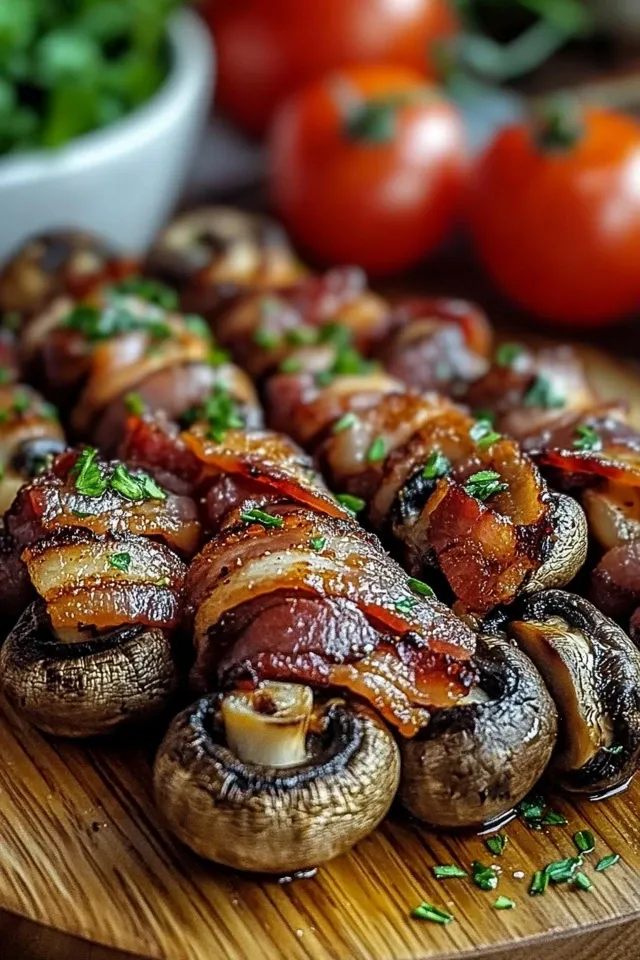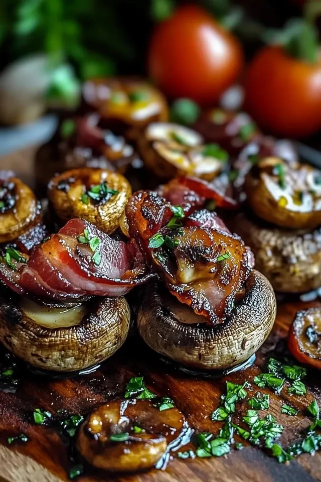 Entdecken Sie eine Vorspeise, die Ihre Gäste begeistern wird: saftige, gefüllte Champignons, umhüllt von knusprigem Rinderbacon. Dieses Gericht ist der Inbegriff von Eleganz und Geschmack, perfekt für jede Zusammenkunft, vom gemütlichen Beisammensein bis zum festlichen Dinner.