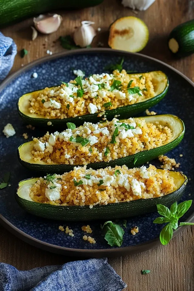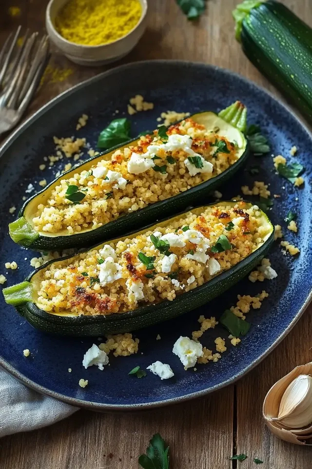 Eine leichte und aromatische Mahlzeit, die in kurzer Zeit zubereitet ist. Diese gefüllten Zucchinihälften sind reich an mediterranen Aromen durch Couscous, Feta, frische Kräuter und knackiges Gemüse. Perfekt für ein gesundes Mittag- oder Abendessen.