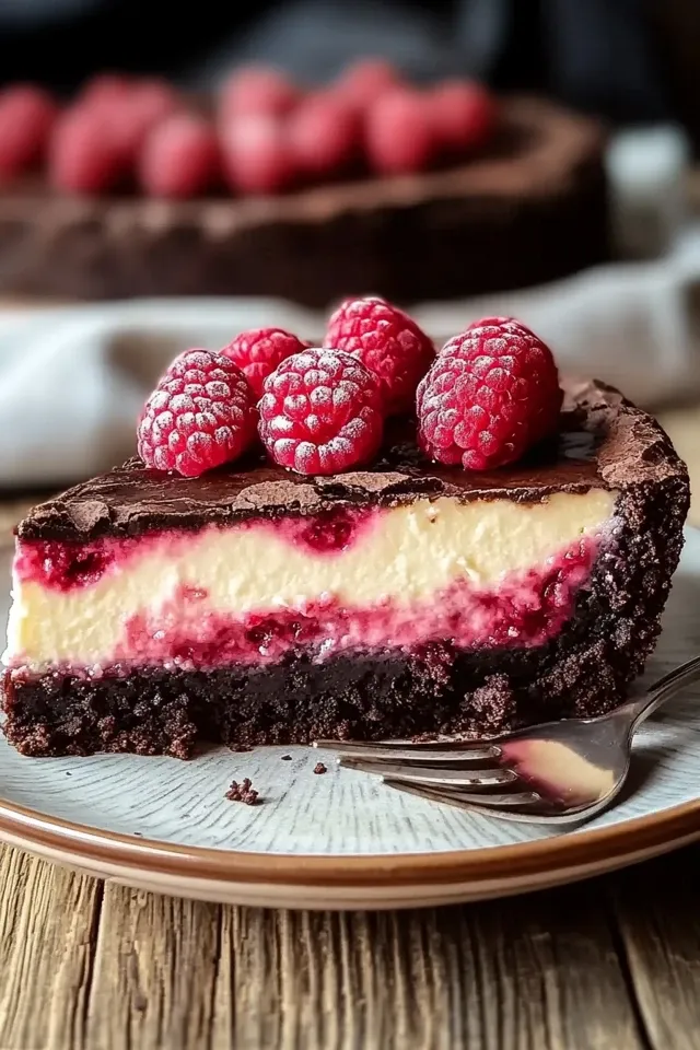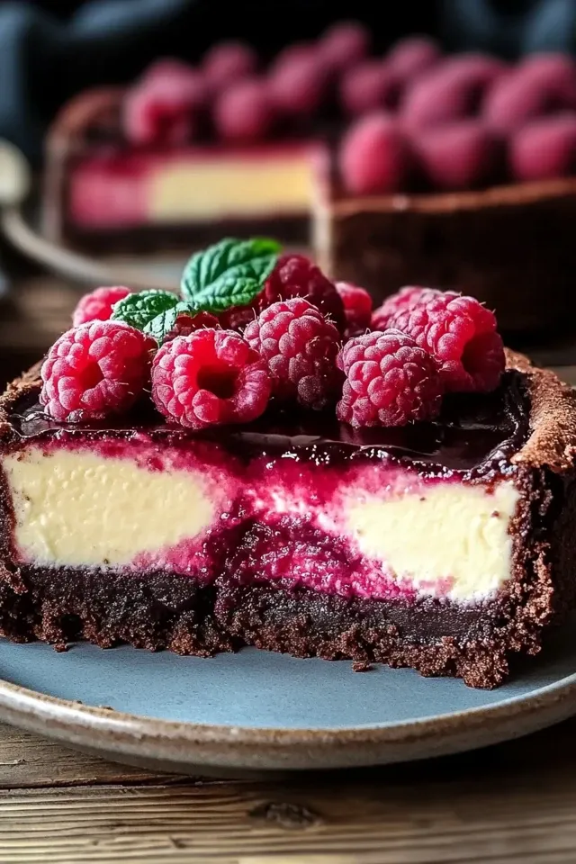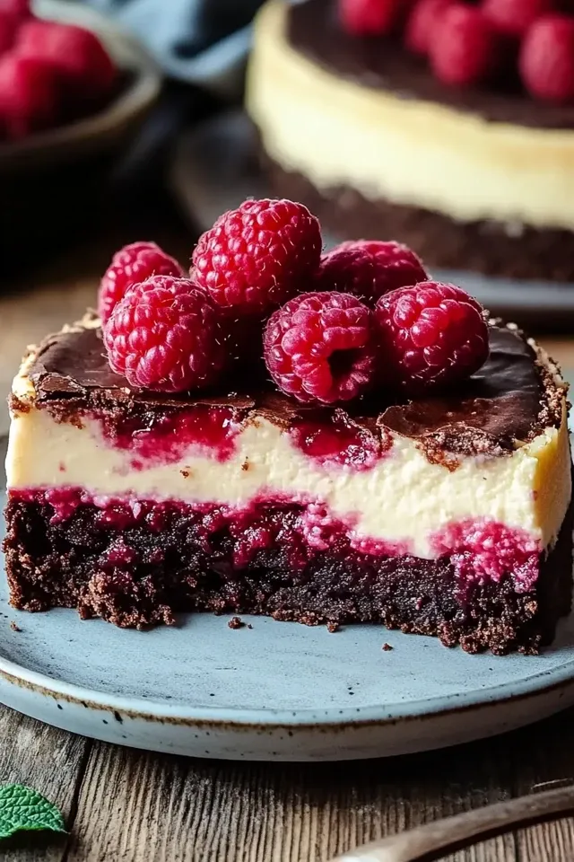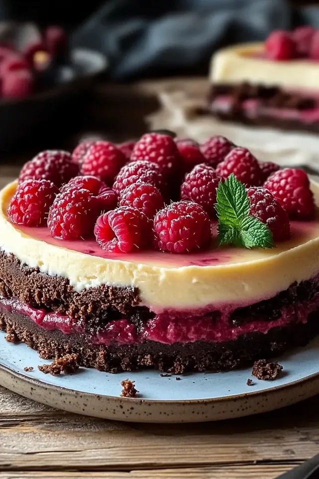 Ein luxuriöses Dessert, das einen dichten Schokoladen-Brownie mit einer cremigen Käsekuchenschicht und frischen Himbeeren vereint.
