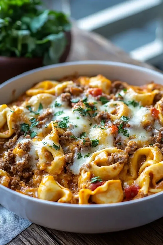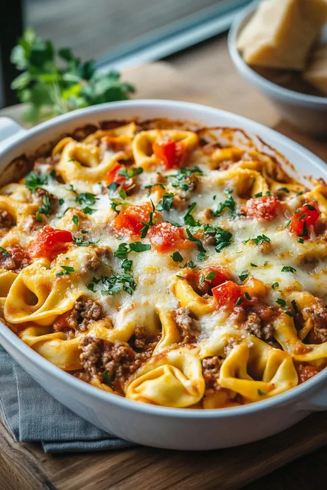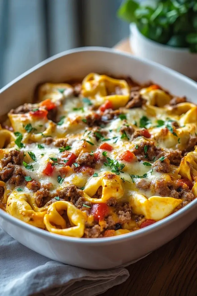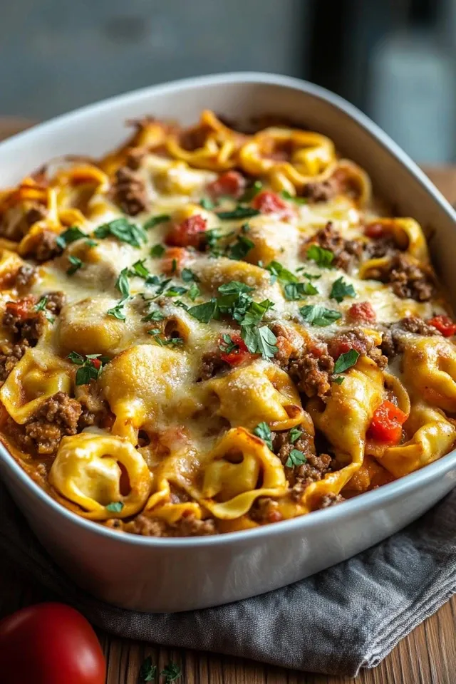 Ein unwiderstehlicher Auflauf, der cremige Tortellini mit herzhaften Taco-Aromen und viel geschmolzenem Käse vereint – perfekt für ein schnelles und köstliches Familienessen.