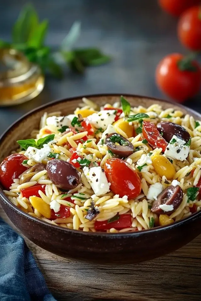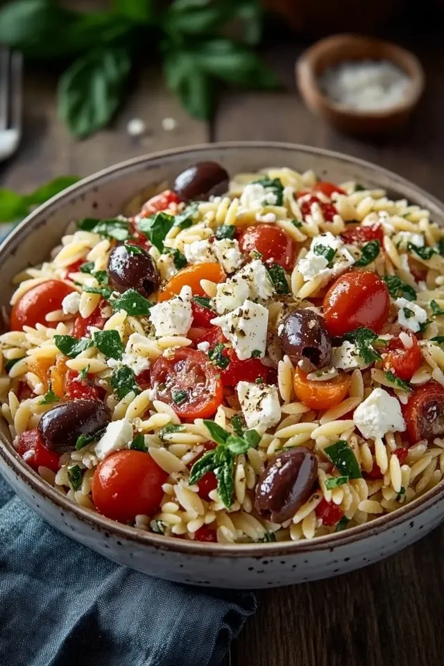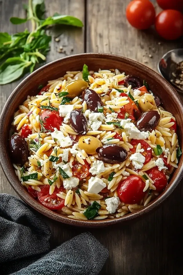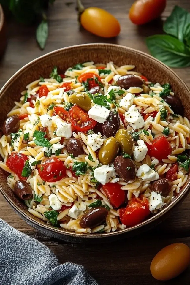 Dieser lebendige und erfrischende mediterrane Orzo Salat ist randvoll mit sonnenverwöhnten Aromen. Gekochter Orzo wird mit würzigem Feta, salzigen Kalamata-Oliven, saftigen Kirschtomaten, knackiger Gurke und einer aromatischen Kräuter-Zitronen-Dressing vermischt. Perfekt als leichtes Mittagessen, Beilage oder für die nächste Party.